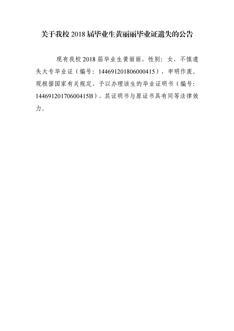 关于我校2018届毕业生黄丽丽毕业证遗失的公告