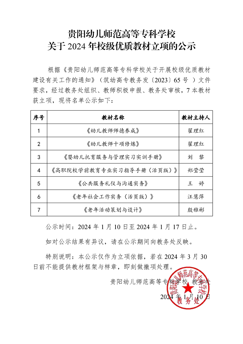 关于2024年校级优质教材立项的公示