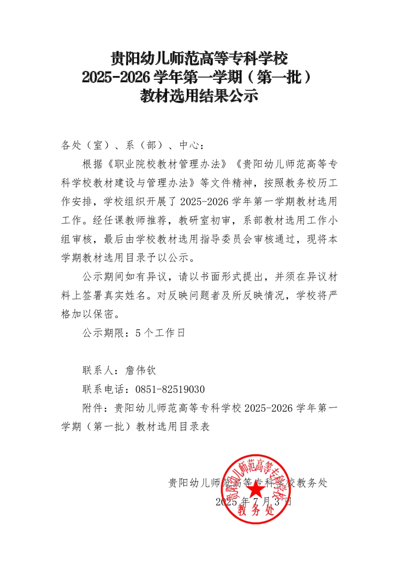 贵阳幼儿师范高等专科学校 2025-2026 学年第一学期(第二批)教材选用结果公示