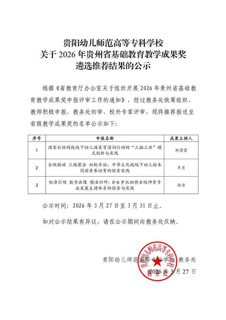 关于 2026 年贵州省基础教育教学成果奖 遴选推荐结果的公示